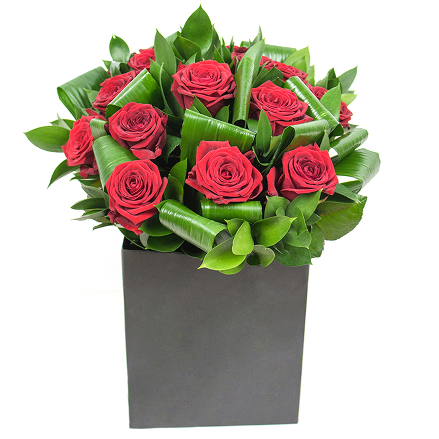 Enhance your space with our sophisticated red rose arrangement, featuring vibrant red roses, luxurious aspidistra leaves, and graceful ruscus. This unique design brings elegance and style to any setting, making it a perfect gift.