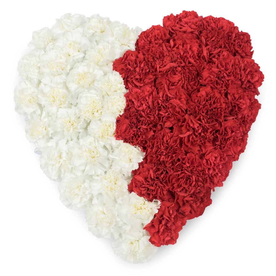 A symphony of red and white carnations arranged in a heart shape to convey deep emotions and lasting beauty.