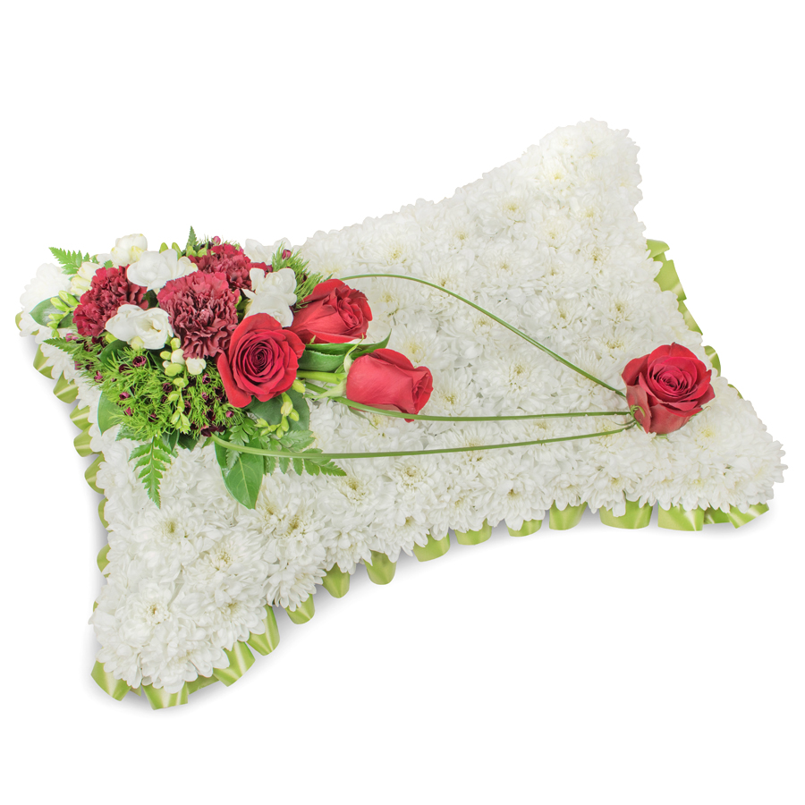 Express your condolences with our stunning floral arrangement. This unique bouquet features white chrysanthemums, red roses, white freesias, dark red carnations, dianthus, and bear grass, each hand-selected to ensure freshness and exceptional quality.